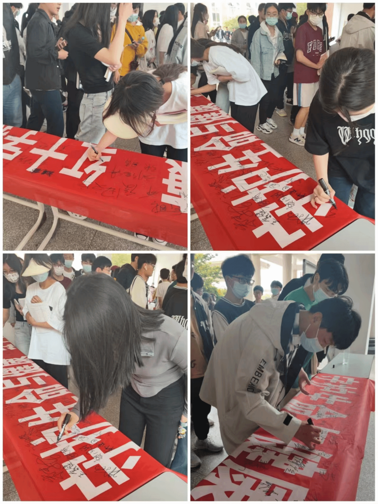 活动负责人带着横幅来到致学楼一楼,横幅上的字样为“守护生命与健康,红十字会就在身边”。相关成员拉起横幅,站在教学楼楼下,我院还贴心准备了马克笔以备签名之用。此时正是放学高峰期,大量同学经过,主动在横幅上留下自己的签名