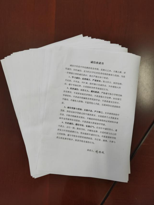 助学贷款受益学生签订了诚信承诺书,承诺以信立人、履约践诺,在申请国家助学贷款,到偿还助学贷款过程中做到不欺诈隐瞒真实情况,不编造和利用虚假的证明材料申请助学金贷款和各项资助,不恶意拖欠国家助学贷款。