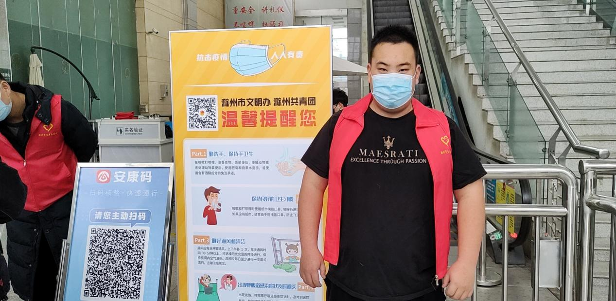 交通运输学院21级城轨5班王滨辉等同学寒假期间积极参加滁州市文明办、滁州市团市委、滁州市青年志愿者协会组织的2022年滁州市青年志愿者春运“暖冬行动”,为春运期间疫情防控和人民群众平安出行提供力所能及的服务。