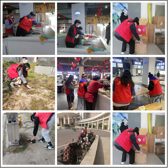 活动中,志愿者们帮助食堂阿姨收拾桌面,和保洁阿姨一起捡拾垃圾,为校快递站整理快递等等。充分展现了志愿者们不怕苦、不怕脏、不怕累的精神,营造了一个温馨整洁的校园生活环境。