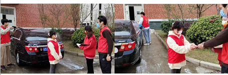 接着,志愿者们又来到实训楼后侧,这里是机械与汽车工程学院组织的洗车志愿者。上前询问中,他们为我们讲解了清洗工作的一些细节,并告诉我们在这过程中,志愿者们可以充分的将学雷锋志愿服务与“我为群众办实事”实践活动结合起来,把践行“雷锋精神”落到了实处。不仅锻炼了自身的专业技术能力,还增强了同学们的奉献服务意识,促进了校风、学风建设,推动了健康文明校园