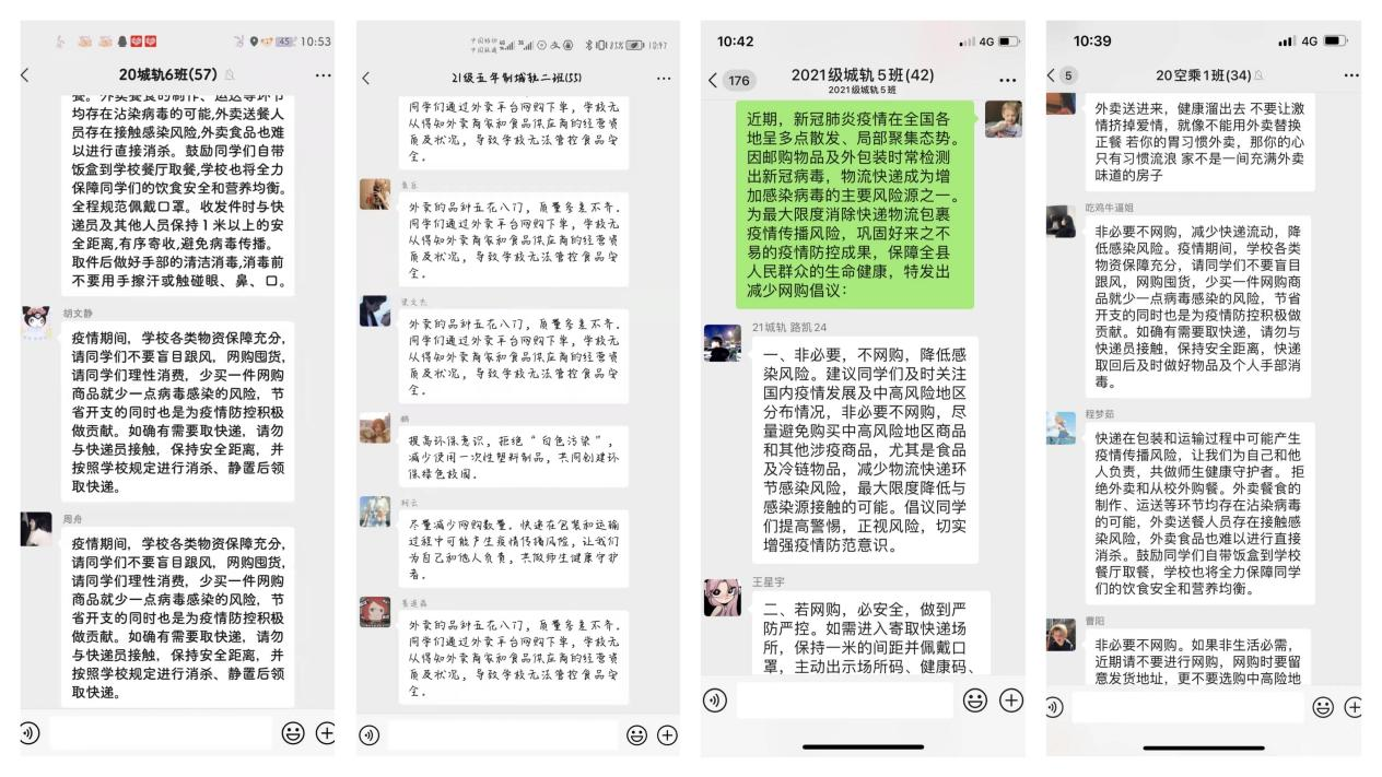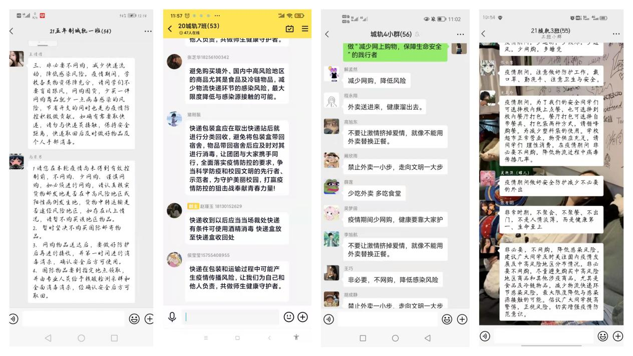 各班级利用微信、QQ群等网络平台提出减少外卖、少网购的倡议书,引导同学们正确认识有关方面的危害,各尽其责,从自身做起,降低外卖送餐、快递流动过程中存在的疫情传播风险。