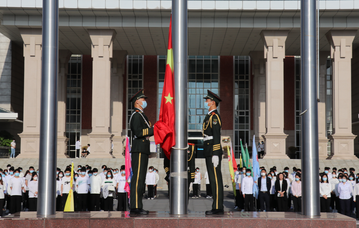 上午7点整,升旗仪式在校和乐广场正式开始。在全场师生的注视中,国护队迈着铿锵有力的步伐,护送国旗走向升旗台。伴着庄严的国歌声,国旗冉冉升起。那飘扬的五星红旗,鲜艳得如103年前的那场爱国之火,以燎原之势迸发在中国新青年心中。