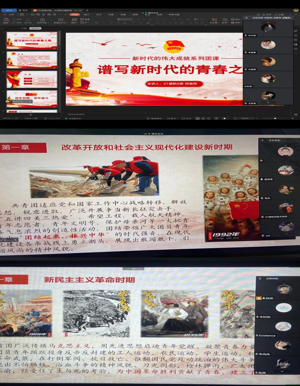 为使同学们深刻领会中国特色社会主义进入新时代的重大意义,8月15-18日,交通运输学院各团支部线上开展了谱写新时代的青春之歌——新时代的伟大成就主题团课。