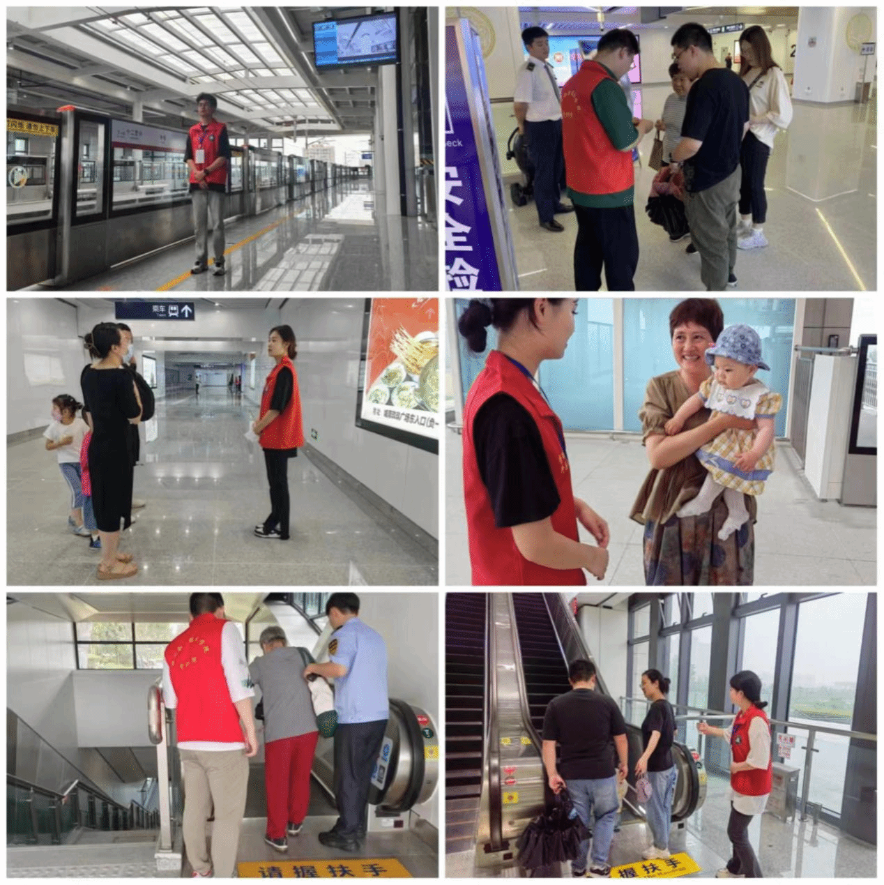 志愿者们被分配到不同的岗位,各个站点站长耐心地讲解了地铁志愿者的要点与注意点。强调参加志愿服务要强化大局意识、责任意识、奉献意识、服务意识,穿戴统一的志愿者马甲、着装标识等规定要求。志愿者们迅速熟悉各个地铁路线,在乘客迷茫或者寻求帮助之际主动为他们提供正确的路线和向导,尽自己所能帮助乘客,为他们引导指路提供信息,对待每位乘客都十分礼貌耐心。看见有乘客越过或在下客区等待地铁时,志愿者们礼貌地提醒他们退到黄线之后并站在等候区等候,引导乘客有序候车,并在地铁即将关门启动之际,站在黄线后做拦截手势,以防危险事故的发生。