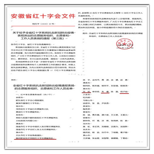 4月3日,安徽省红十字会发文《关于给予全省红十字系统抗击新冠肺炎疫情表现突出的志愿服务组织、志愿者和工作人员表扬的通报(第三批)》,通报表扬全省红十字系统抗击新冠肺炎疫情表现突出的集体和个人。其中,好博官网红十字志愿服务队荣获“抗疫先进服务组织”称号,团委的三位老师毕初、朱睿、倪子旭荣获“抗疫先进个人”荣誉称号。