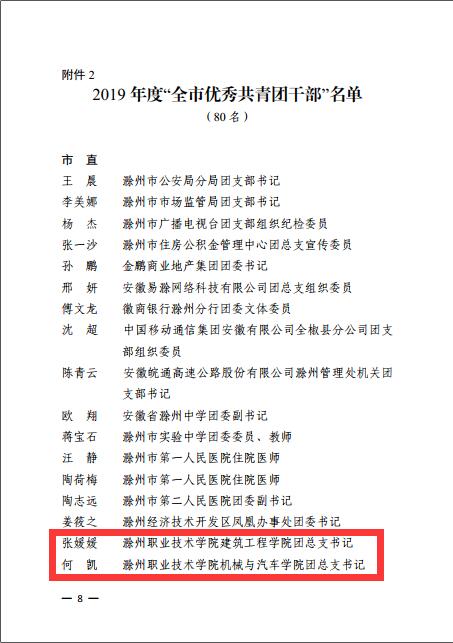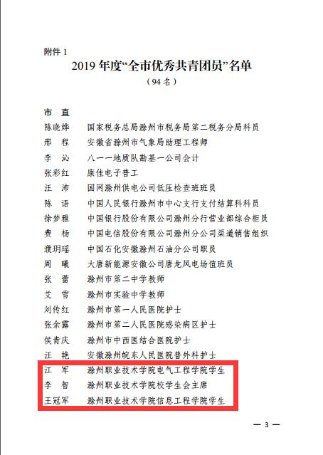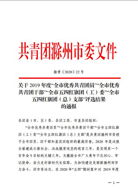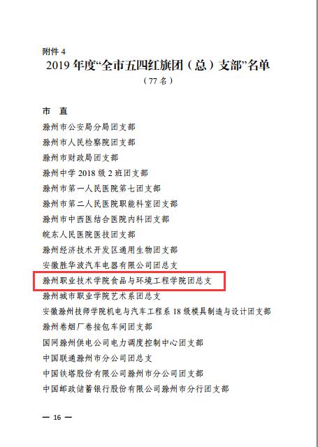 近日,共青团滁州市委发布了《关于2019年度“全市优秀共青团员”“全市优秀共青团干部”“全市五四红旗团(工)委”“全市五四红旗团(总)支部”评选结果的通报》。好博官网食品与环境工程学院团总支被授予“滁州市五四红旗团(总)支部”荣誉称号,建筑工程学院团总支书记张媛媛、机械与汽车学院团总支负责人何凯被授予“滁州市优秀共青团干部”荣誉称号,江军、李智、王冠军同学被授予“滁州市优秀共青团员”荣誉称号。