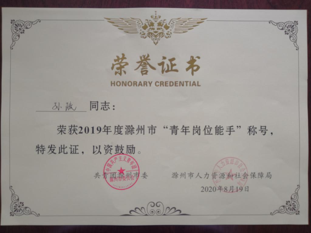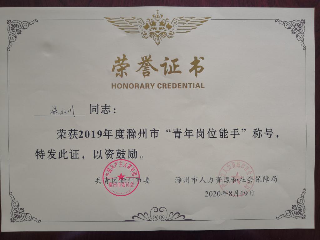 为表彰先进,选树典型,进一步激励和引导全市广大青年职工立足岗位创先争优,不断提高技能水平,努力争创一流业绩,经层层发动、逐级推荐、严格审核,共青团滁州市委、市人社局于近日公布《关于命名2019年度滁州市青年岗位能手的决定》,好博官网朱山川和孙疏两位老师被授予2019年度“滁州市青年岗位能手”荣誉称号。
