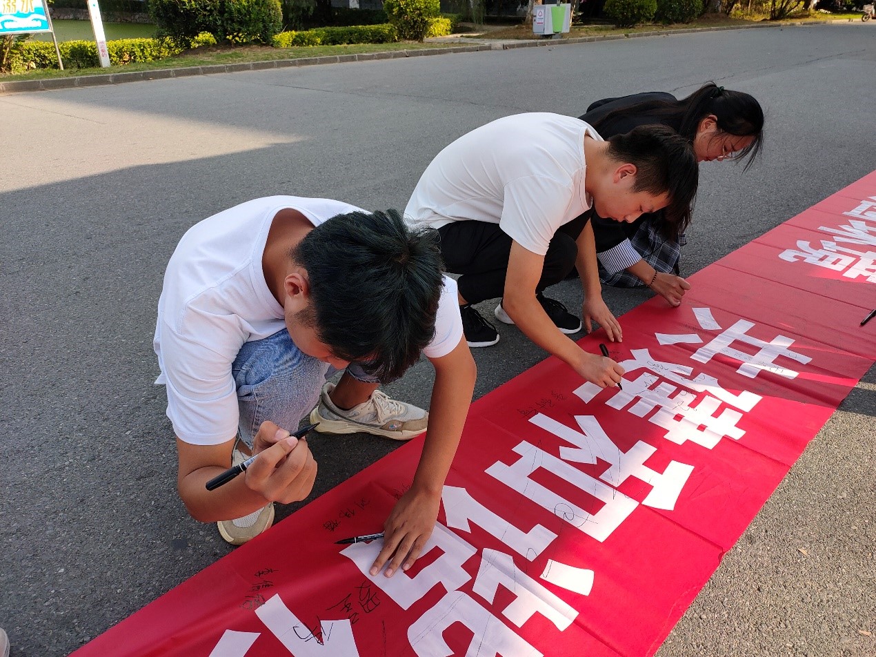 活动现场,志愿者们向过往同学们宣传“做文明学生 创文明校园”倡议书,号召广大师生自觉参与到文明校园和文明城市创建中来,遵守市民文明公约,维护城市公共秩序,搞好学校社区环境卫生;关爱弱势群体,传递社会正能量。大家在横幅上郑重地签下了自己的名字,也表达了创建文明校园的决心。