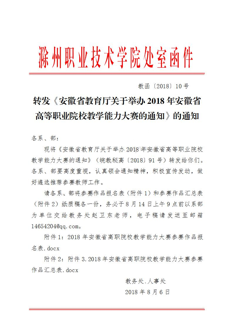转发《安徽省教育厅关于举办 2018 年安徽省高等职业院校教学能力大赛的通知》的通知
