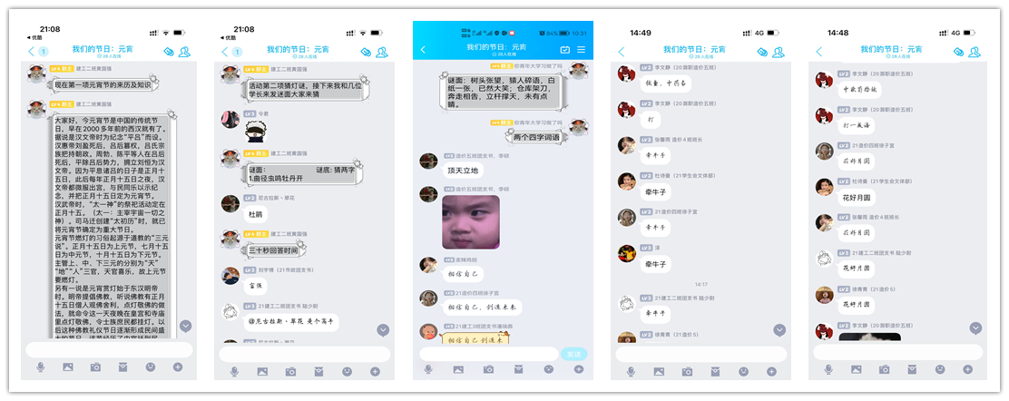 “灯火钱塘三五夜,明月如霜,照见人如画。”元宵节又叫上元节、春灯节,寄托着中国人追求团圆和美满的愿望,代表着阖家团圆、美满幸福。为弘扬社会主义核心价值观,渲染校园文化气息,2月15日,建筑工程学院团总支举办“线上猜灯谜,欢乐闹元宵”活动,在增添节日气氛的同时也让同学们感受到了中华传统民俗的文化特色,让这个节日度过的更有意义。