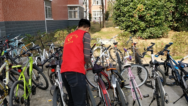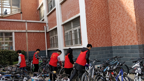由于大多男同学存车随意摆放,废弃车辆为数较多且堆放无序,导致同学们存车取车非常麻烦,给住宿同学造成一定困扰,影响了校内干净整洁的氛围。我系团总支志愿者本着为同学服务、奉献校园的精神,对车库进行整改。志愿者们不怕脏不怕累,手上的灰尘是他们无私奉献的印记,头上的汗水是他们服务社会的荣誉。为建设整洁滁职共同努力。