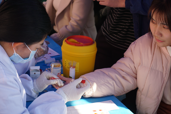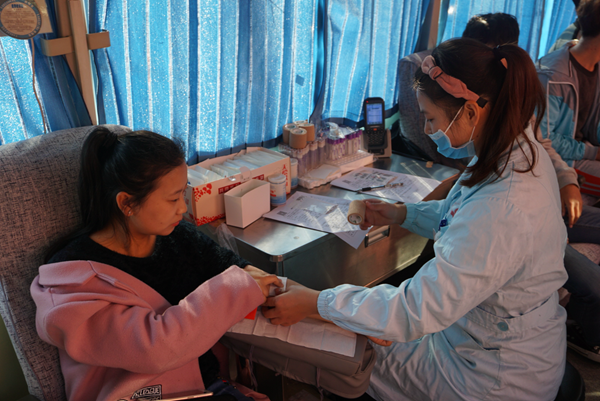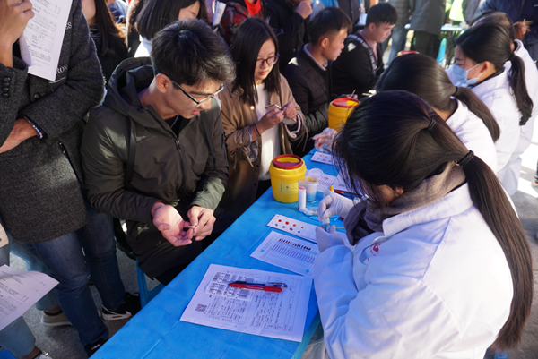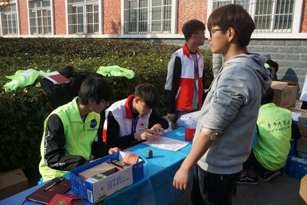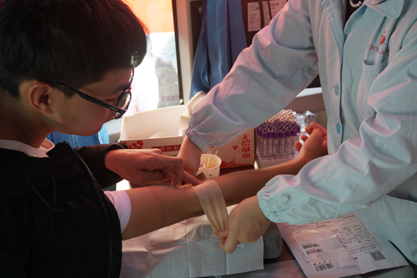 我系同学按计划来到献血点,在医务人员的安排下,同学们按顺序进行无偿献血的流程。在服务人员的鼓励下,满怀勇气和爱心的同学们处理创口之后他们稍事休息并领取了无偿献血证和精美礼品。