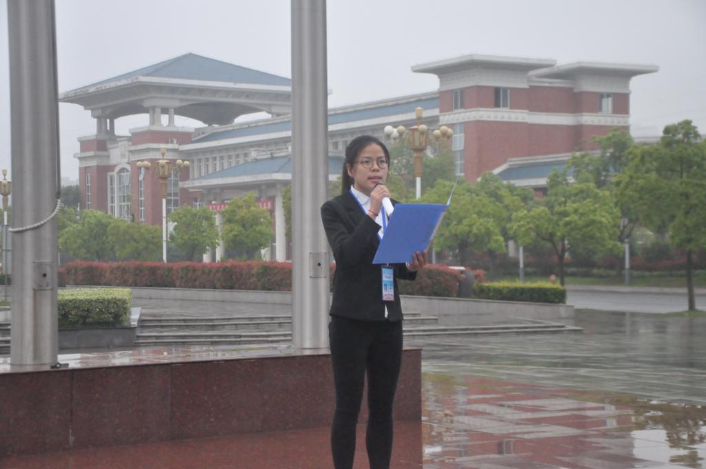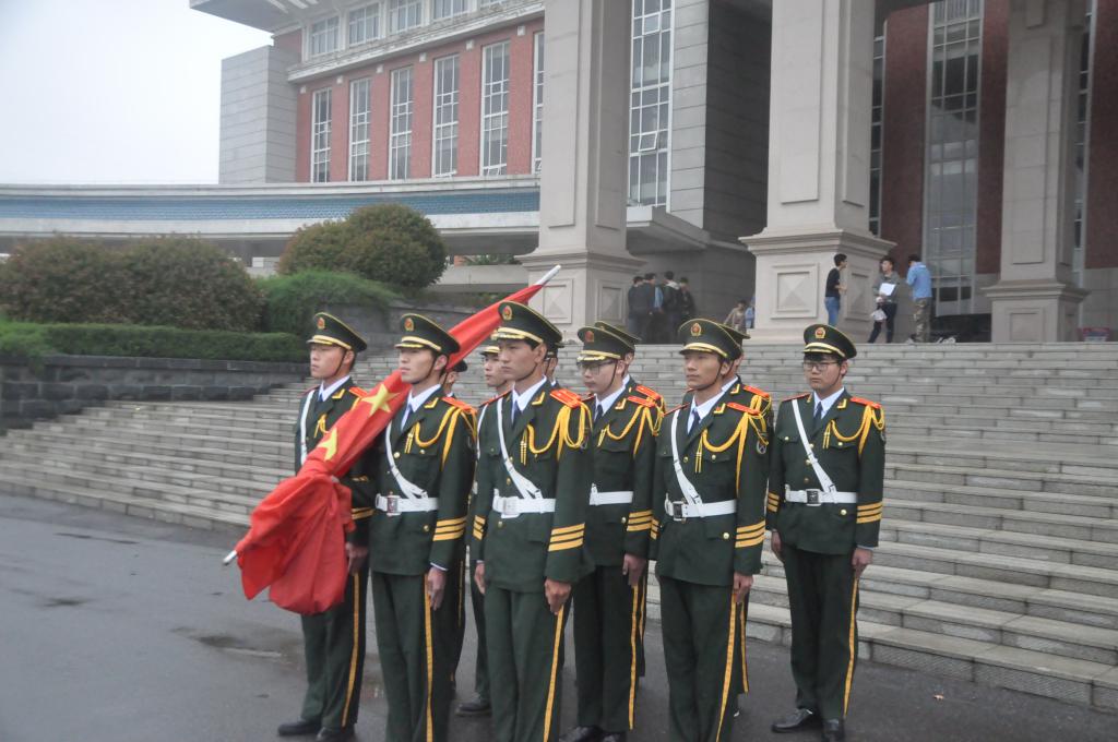 天刚微微亮,微风细雨中,传媒系学生会成员便已经在升旗台前列队等候。当国歌奏响,升旗仪式正式开始。随着旗手缓缓摇起摇杆,五星红旗冉冉升起,在场所有成员庄严肃立,目光都聚集在五星红旗之上。即使下着小雨刮着冷风,但同学们此刻的内心是热血沸腾的。