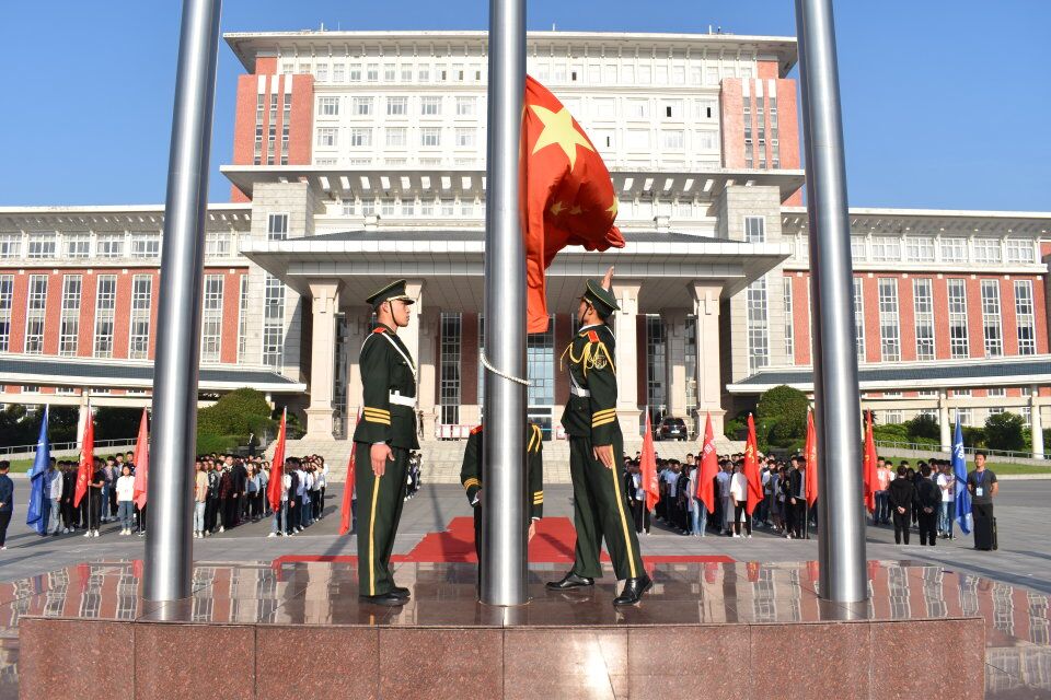 早上七点整,旭日初升,仪式正式开始,仪仗队高举鲜红的五星红旗向升旗台走去,五星红旗伴随着庄严的国歌在阳光下缓缓升起,活动现场庄严肃穆。升旗仪式结束后,由学生代表高晴演讲发言。各系部同学认真聆听,纪律良好。