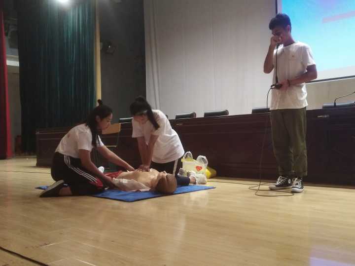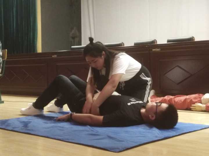 活动开始,我系红十字志愿者亲自演示当发现身边的人出现了紧急情况时如何进行急救并进行正确的包扎,随后志愿者一一完成演示,并请四名新生同学上台示范。同学们都很热情,极力地完成了“急救”措施,活动进行的十分顺利。