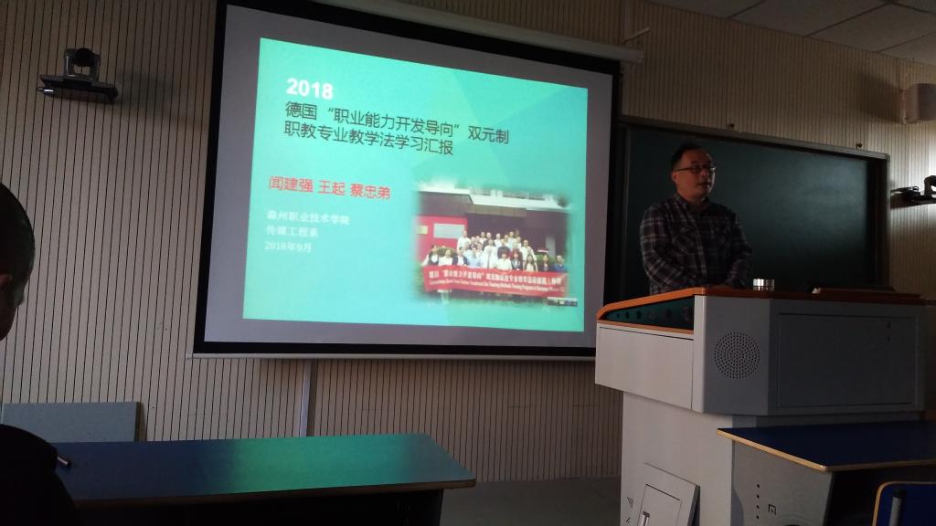 首先,闻建强副教授从德国的概况、历史、文化、职业教育的起源、职业教育的框架讲起,分析了德国职业教育与中国职业教育的异同,介绍了此次参训学习的主要内容及形式,重点就德国“双元制”的内涵、实施、各方的权利和义务、人才培养模式的优势、效果及德国制造与“双元制”职教理念的内在联系进行分析和解读,还就我国所提出的“一带一路”、“先进制造”、“中国梦”等战略部署及理念的提出与德国职业教育的关系展开论述,列举了一些优秀工业产品的案例。