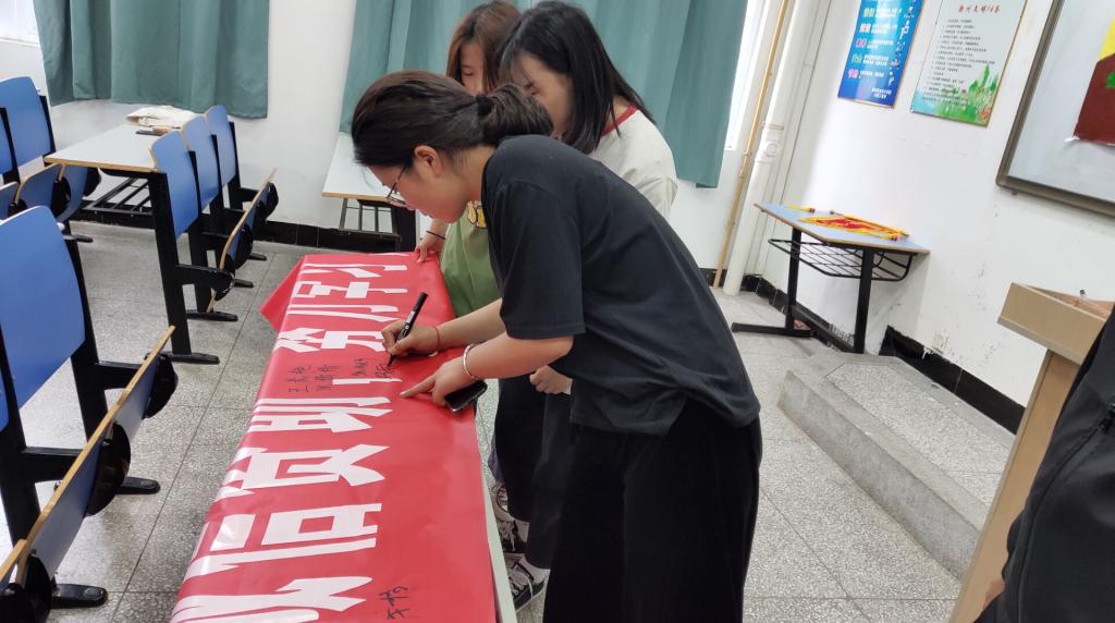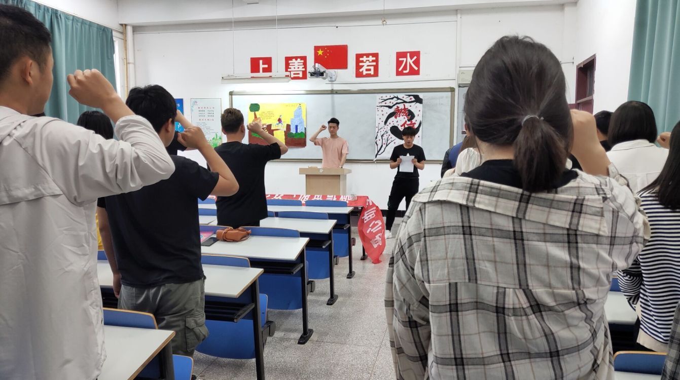 会议伊始, 各个学生在横幅上签名承诺,随后卢开新宣读了相关文件,要求大家要积极参加有关诚信资助的各项活动,最后由学生代表上台带领同学们进行宣誓。