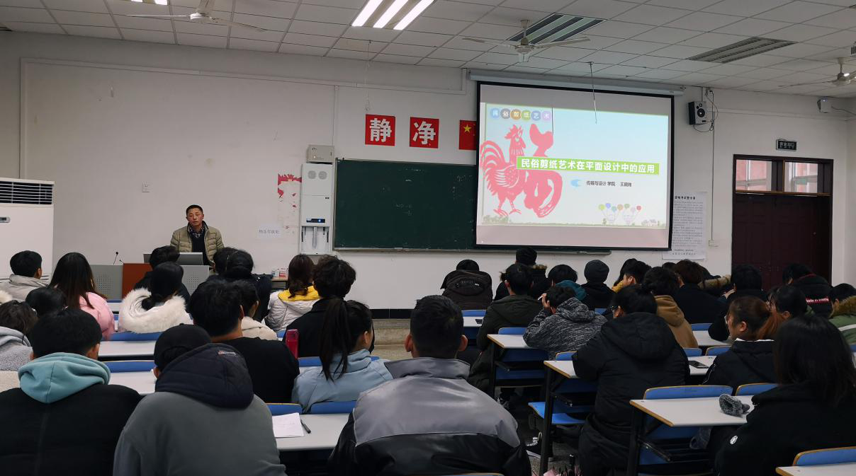 2019年12月25日15:00-17:00传媒与设计学院王晓玮副教授于北阶106教室举办了“民俗剪纸艺术在平面设计中的应用”学术讲座,传媒与设计学院广告设计、室内设计等专业同学聆听了本次讲座。