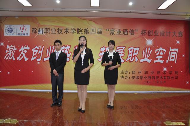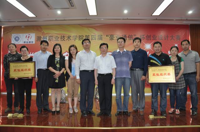 “激发创业热情,拓展职业空间”,5月22日,由学院招生就业处、团委、学生处主办,安徽豪业通信技术有限公司冠名,各系部协办的“豪业通信杯”第四届大学生创业设计大赛在五楼报告厅隆重举行。安徽豪业通信技术有限公司董事长范斌、学院院长李柱梁、院长助理、招生就业处处长穆松亲临现场观摩比赛,并为获奖选手颁奖。