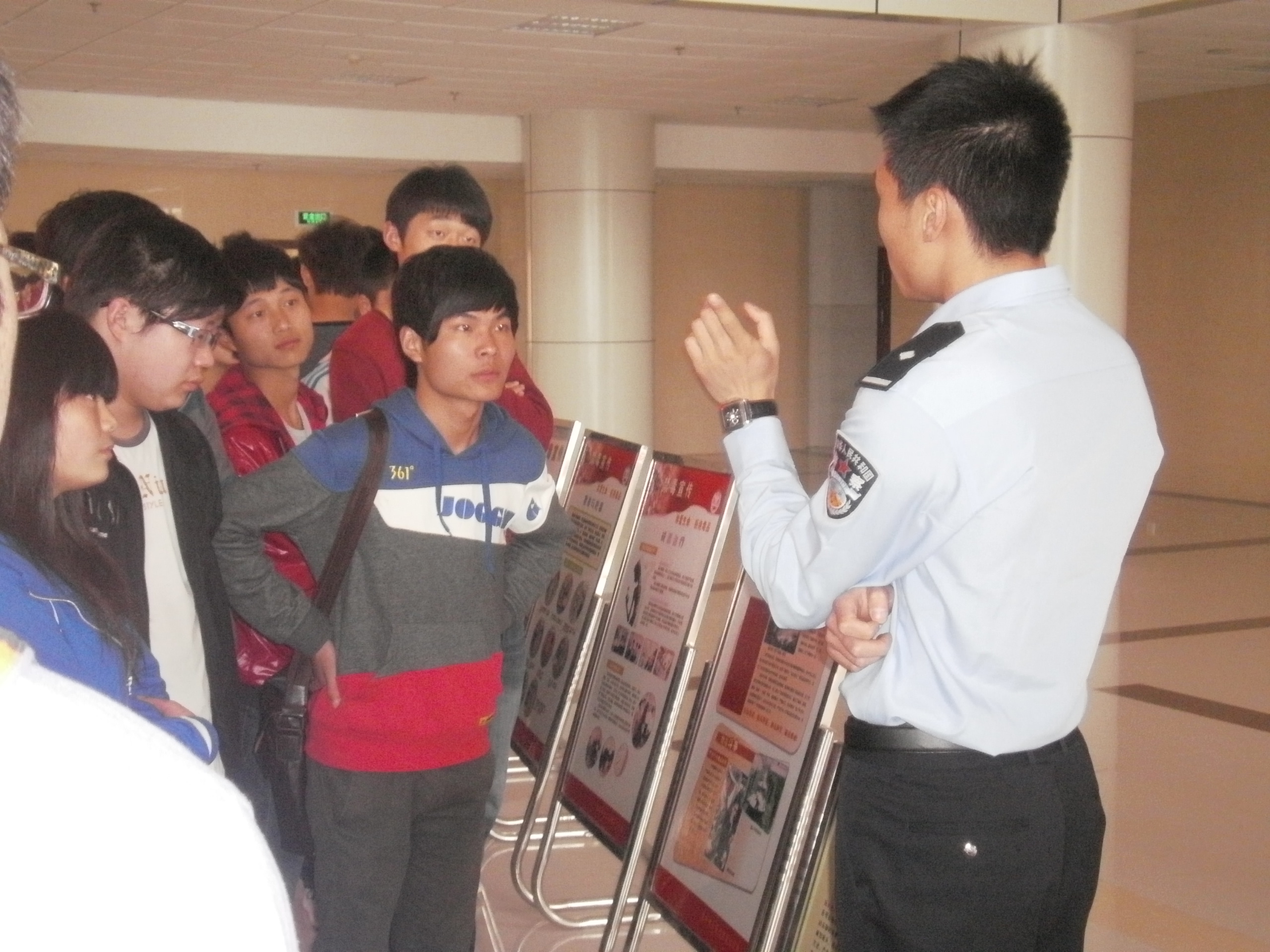 滁州市公安局开发区刑警大队李超警官正在结合禁毒图片展给师生们进行讲解