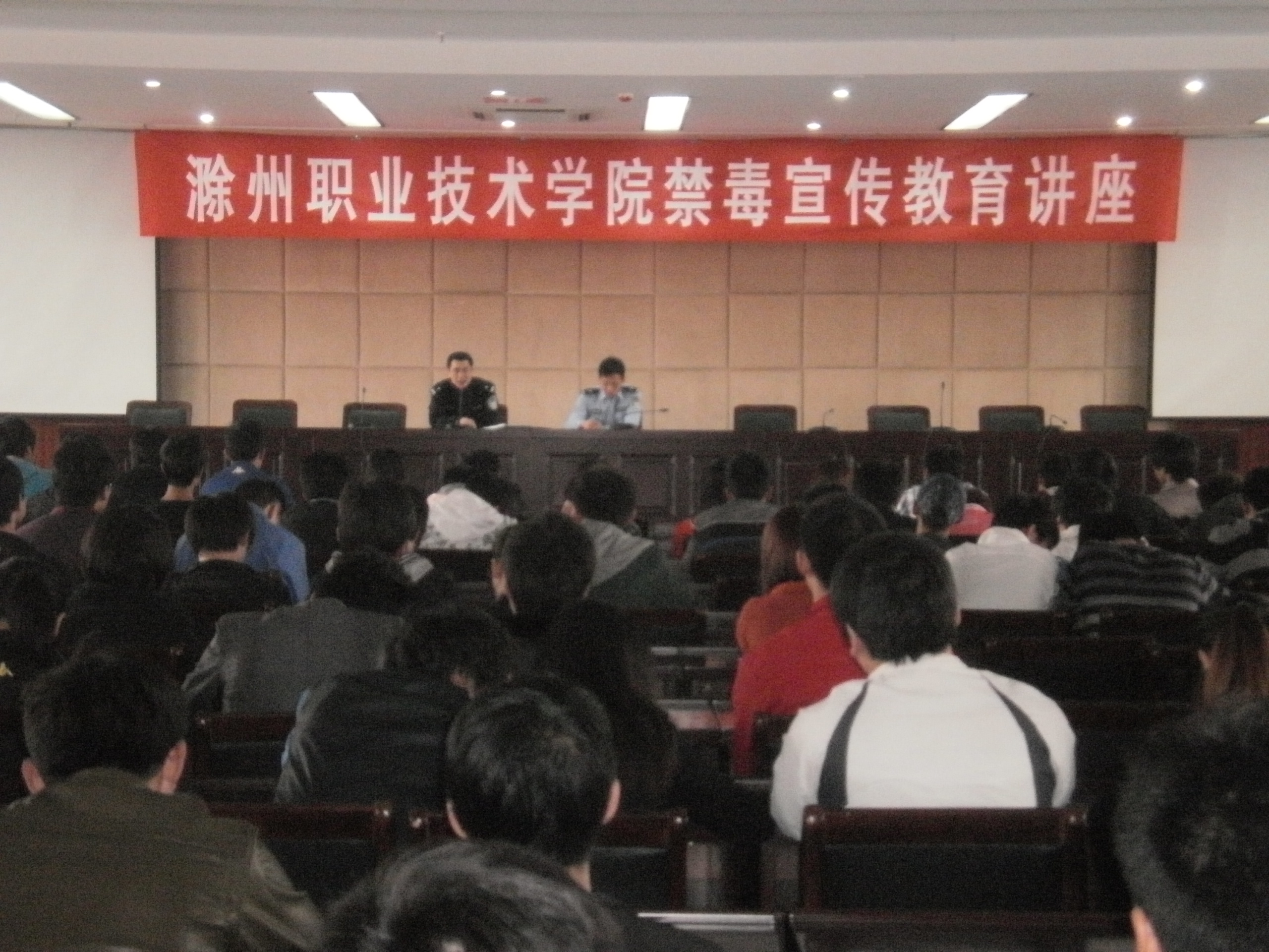 2012年4月12日下午,为迎接“6.26”国际禁毒日的到来,我院保卫处联系了滁州市公安局禁毒支队来院做禁毒专题教育讲座。讲座由滁州市禁毒支队陈万社教导员主讲。滁州市公安局开发区刑警大队李超警官及学院保卫处、各系部共计280余名师生在综合办公楼五楼报告厅参加了此次活动。