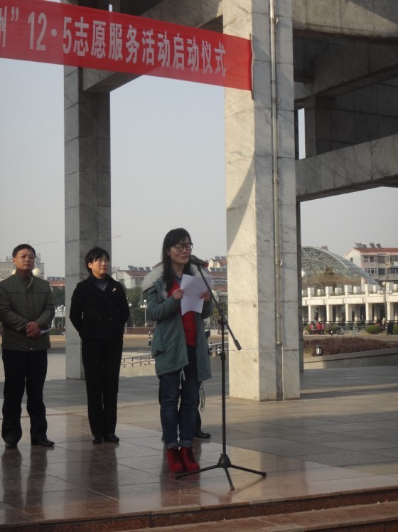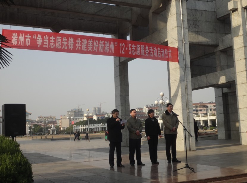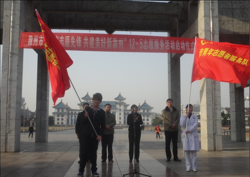 “奉献、友爱、互助、进步”的志愿精神,12月5日下午,滁州市志愿服务活动启动仪式在人民广场举行,市文明办主任周全教出席讲话,市直机关工委书记朱荣、团市委书记邓继敢向志愿者代表授旗。我院经贸系志愿者胡思彬同学代表全市志愿者发言、技师学院同学代表我院志愿者服务队接受志愿者授旗。