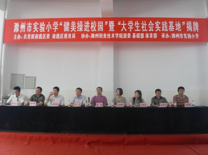 5月10日下午,我院学生社团“健美操协会”与实验小学结对仪式在实验小学艺术楼报告厅举行。仪式由实验小学副校长杜佐运主持。出席仪式的还有基础部党总支书记李超、院团委书记王蓓蓓、南谯团区委书记张伟、副书记庚丽娜、实验小学校长柴玉峰、我院体育教师王厚红以及部分我院健美操协会的会员和实验小学的师生。