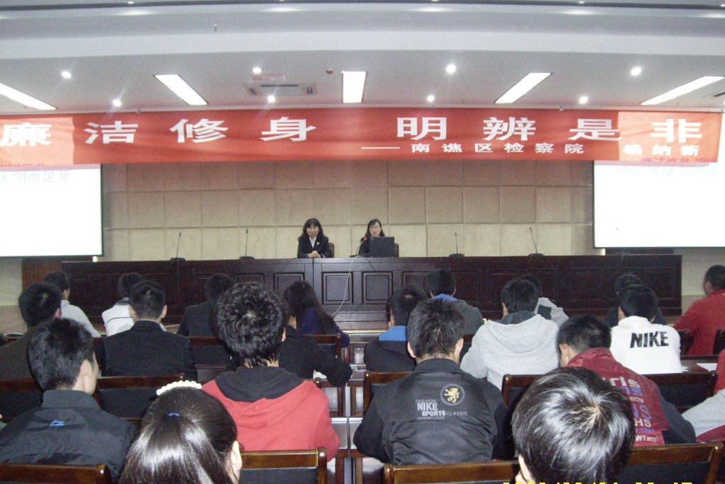 为进一步创建良好的校风和校园“廉洁文化”氛围,推进校园文化建设,按照学院学风建设年活动安排和院领导要求,2011年11月22日晚7点,在学院综合楼5楼学术报告厅,院学生处协调组织、举办了一场《廉洁修身 明辨是非》的廉洁教育专题讲座。讲座特邀南谯区检察院控申科科长杨纳新检察官主讲。