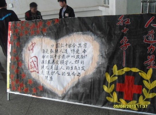 5月8日清晨,我院红会志愿者预先准备好的帐篷、海报、条幅等一系列宣传物品,摆放到我院老食堂北门做红会宣传,志愿者为来往的同学讲解“博爱、人道、奉献”的红十字精神,并请同学到条幅上签字,让同学们进一步了解红会、充分认识红会。
