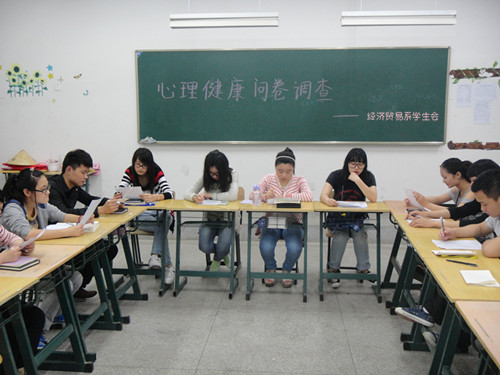 2013年5月25日晚,经贸系学生会向全体大一新生展开了心理健康调查问卷活动,该问卷主要针对学生上课出勤状况、自我学习能力、人际交往态度以及学生恋爱等问题。活动以书面形式作答,各部门干事将问卷分发给被调查同学,作答后再统一收回,最后抽取部分具有代表性的问卷研究分析,并对同学们易出现的心理状况进行合理的疏导。