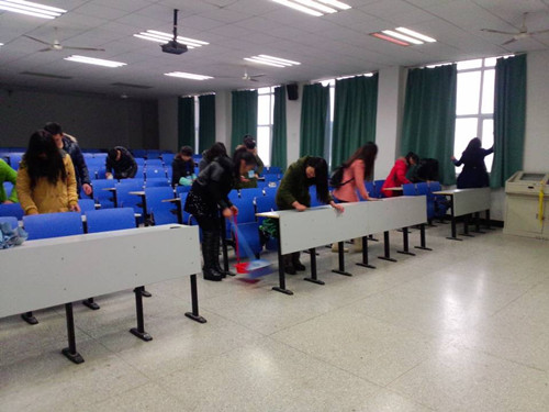 本次活动旨在把爱护公物落实到实际行动中。大家齐心协力清除系部各个教室课桌上的涂痕,经过一下午的辛苦奋斗,每个教室都焕然一新。