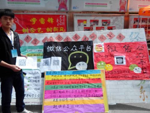 2014年4月1-2日,经济贸易系团总支学生会在学院女生宿舍一号楼下开展了经贸系微信公众平台的宣传推广活动。