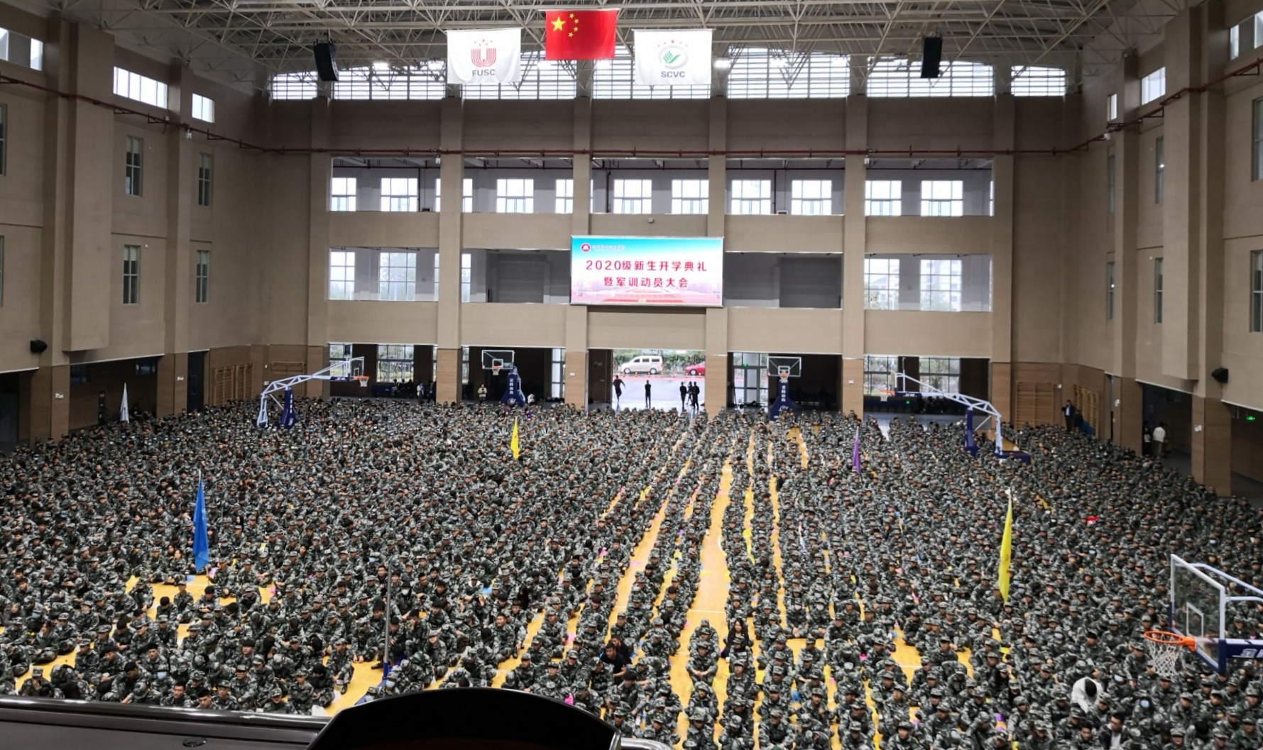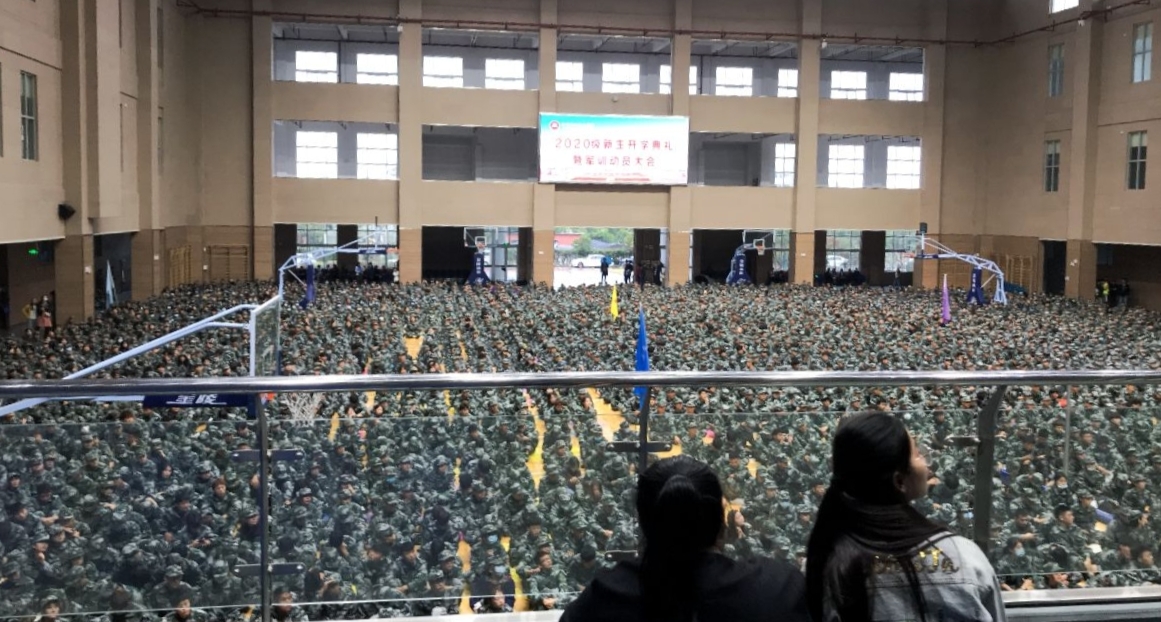 管理学院全体新生于2020年10月15日下午三点在体育馆参加2020年新生军训动员大会。