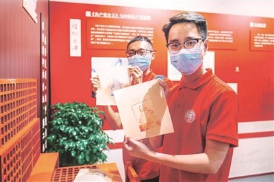 1920年,复旦大学老校长陈望道翻译首个中文全译本《共产党宣言》。2018年5月,复旦大学修缮了陈望道旧居,以“信仰之源”为主题打造《共产党宣言》展示馆,融宣传教育、社会实践、学术培养为一体。一批复旦青年师生党员自发追寻“真理的味道”,组建了党员志愿服务队,面向广大师生和社会各界开展宣讲活动。图为志愿服务队队员在展示《共产党宣言》陈望道译本首版和第二版的复制封面纪念品。