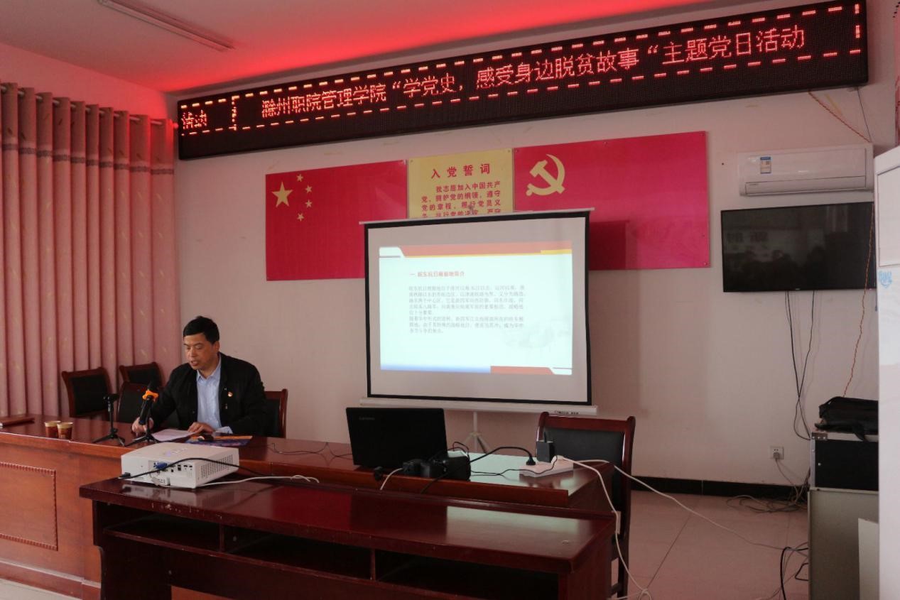 耿学刚以《中国共产党皖东抗日根据地——皖东自卫战》为主题,向大家介绍了皖东抗日根据地的基本情况、皖东自卫战的背景、路西自卫反击战的斗争情况,学习抗日英雄们的光辉事迹和革命精神。