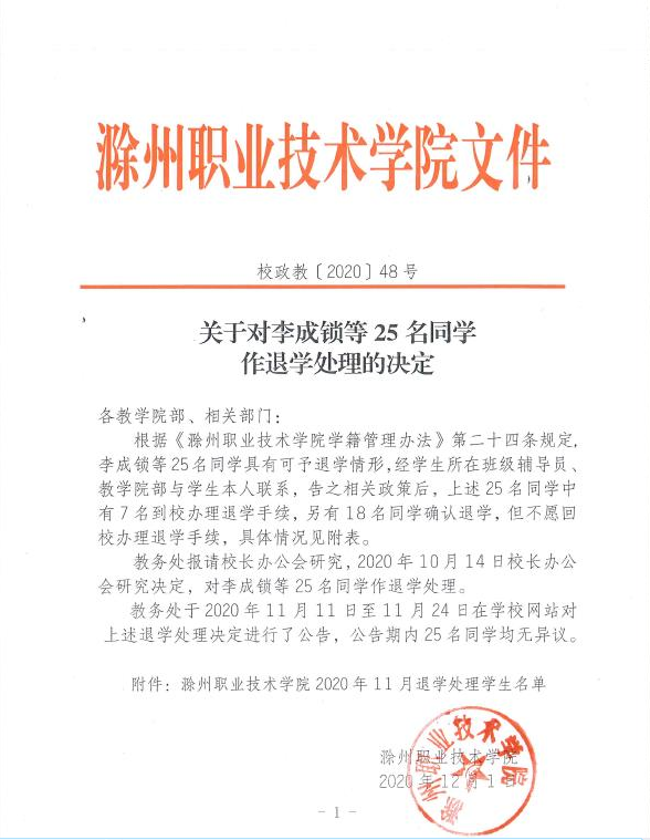 关于对李成锁等25名同学作退学处理的决定 校政教〔2020〕48号