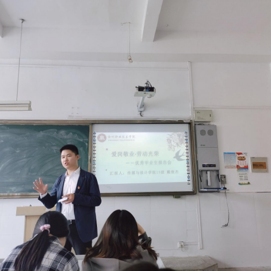 为强化劳动观念,弘扬劳动精神,引导传媒与设计学院在校学生进行职业定位,确立“爱岗敬业·劳动光荣”的人生目标,5月12日下午,邀请优秀毕业生戴俊杰在艺102教室举行优秀毕业生报告会。